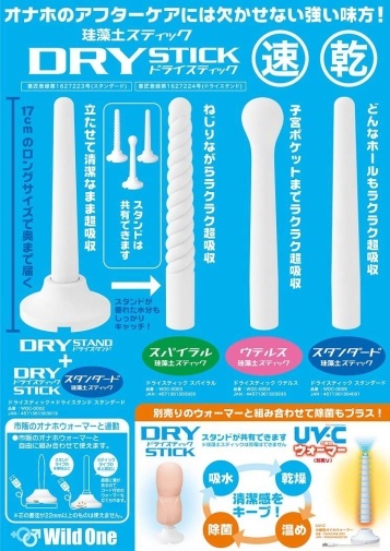 The Dry Stick Standard is a highly absorbent stick for drying deep inside your masturbator toys, thanks to the generous length and the keisodo (diatomite or diatomaceous earth) material, which absorbs moisture quickly and effectively. This is the regular version in this series, offering a straight, consistent stick that fits a wide range of pocket pussy toys. Insert it into your washed onahole, twist the stick, and then leave to dry. The stick also fits the practical stand that is part of this series for leaving your toys to dry upright and upside down.