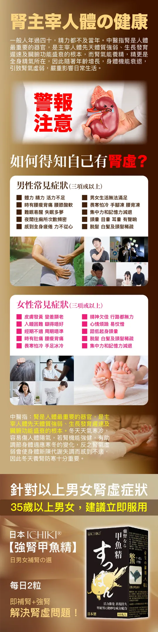 選用古代皇室御品 - 中華甲魚為主要成分,其營養豐富,有滋陰補腎,補中益氣,行氣活血及緩解疲勞等作用。配合蜂王漿、瑪卡、蓽茇及L-精氨酸等營養成分,能增強體力,改善起動能力,運動時提升活力、動力和耐力。本品由日本藥廠生產,安全無副作用,不含西藥、不催谷、不依賴,適合三高人士服用,是每日補身之聖品!