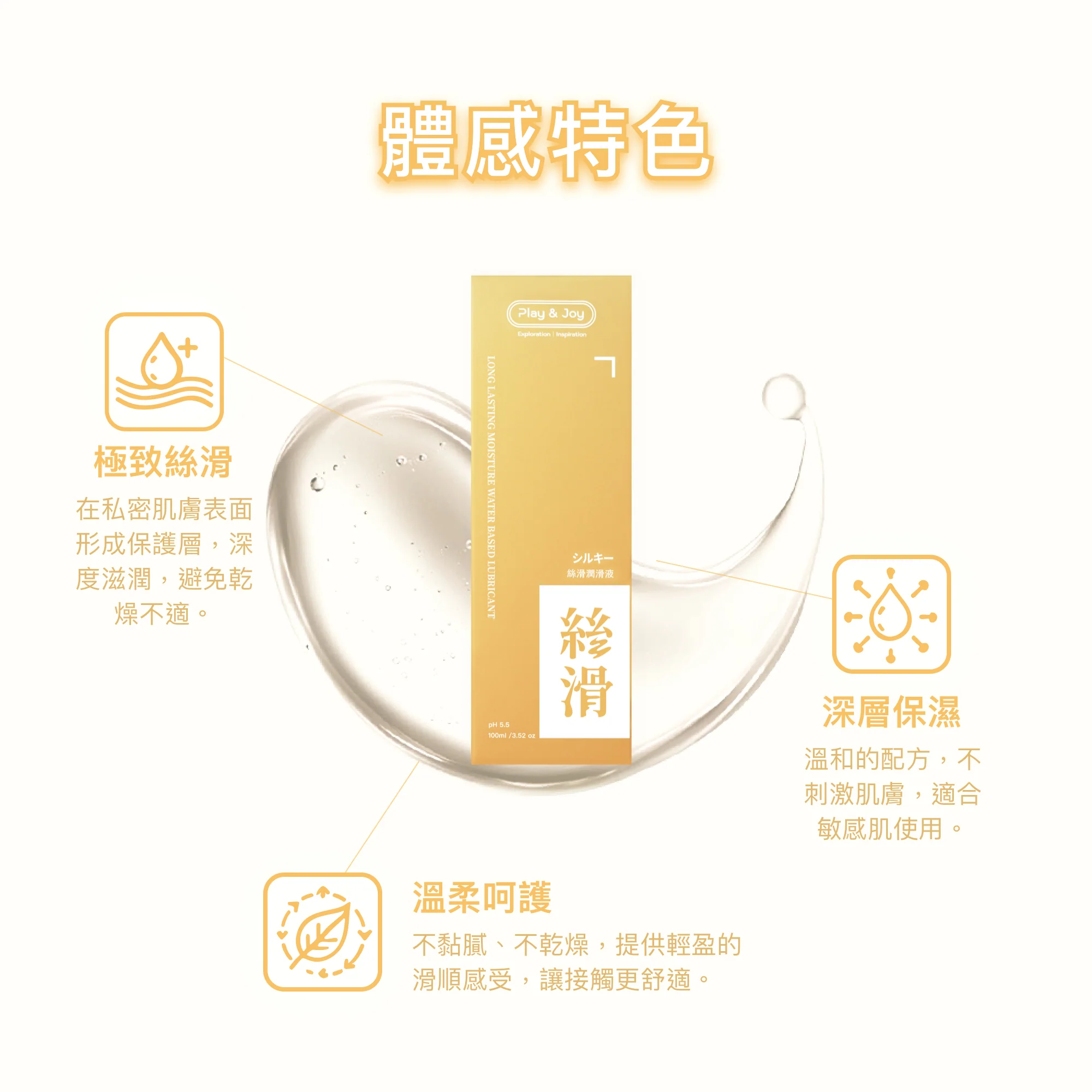 PLAY & JOY 潤滑液可依實際需要重複使用於男女私密部位之按摩潤滑保養並增添情趣。這款絲滑款潤滑液質地較濃稠,呈現啫喱狀,適合易乾體質/性交時間較長人士使用。