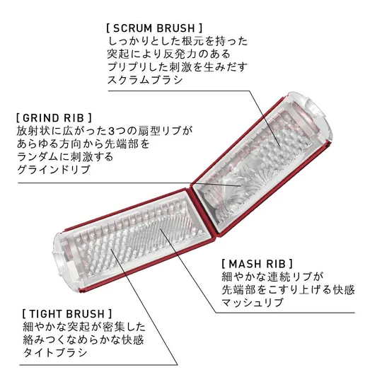 世界首創,採用對摺結構,令複雜的內璧結構得以實現。由於可以打開沖洗,清潔變得方便且更衛生。大量的球狀結構及真空泵等新的機能,刺激的部位和快感的變化強烈。在常清潔及小心使用情況下,可使用 50 次。附有 3 種不同配方的潤滑劑。 一個可自我操控快感的裝置。